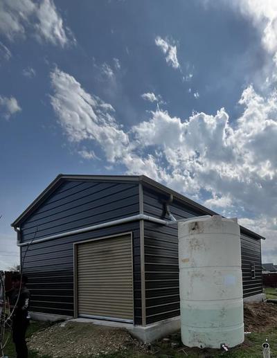 6" K-Style Seamless Gutters in the color Bucksin and pvc down spouts into water collection.
